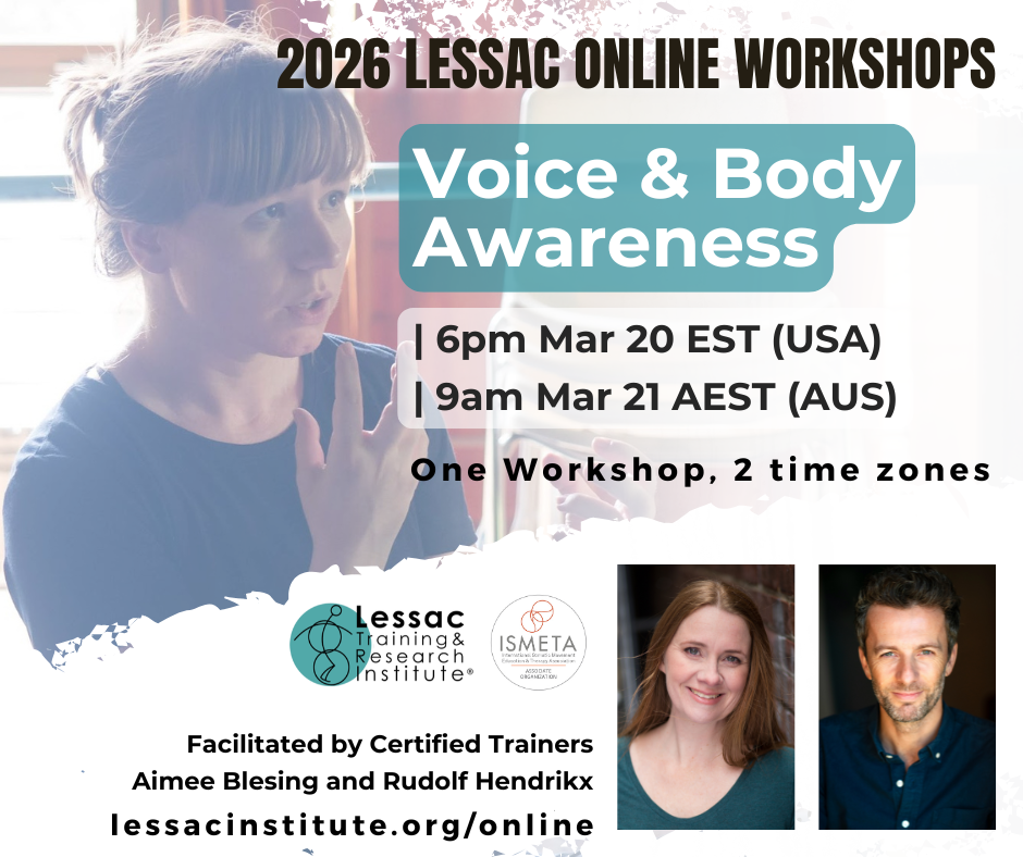 Join Lessac Certified Trainers for a series of 90 minute workshops in Lessac Kinesensic BodyVoice Training. These workshops offer you a number of opportunities to explore the work in the comfort of your own home. These workshops are ideal for anyone curious about the work, or anyone looking for creative ways to embody more dynamic self-awareness.
